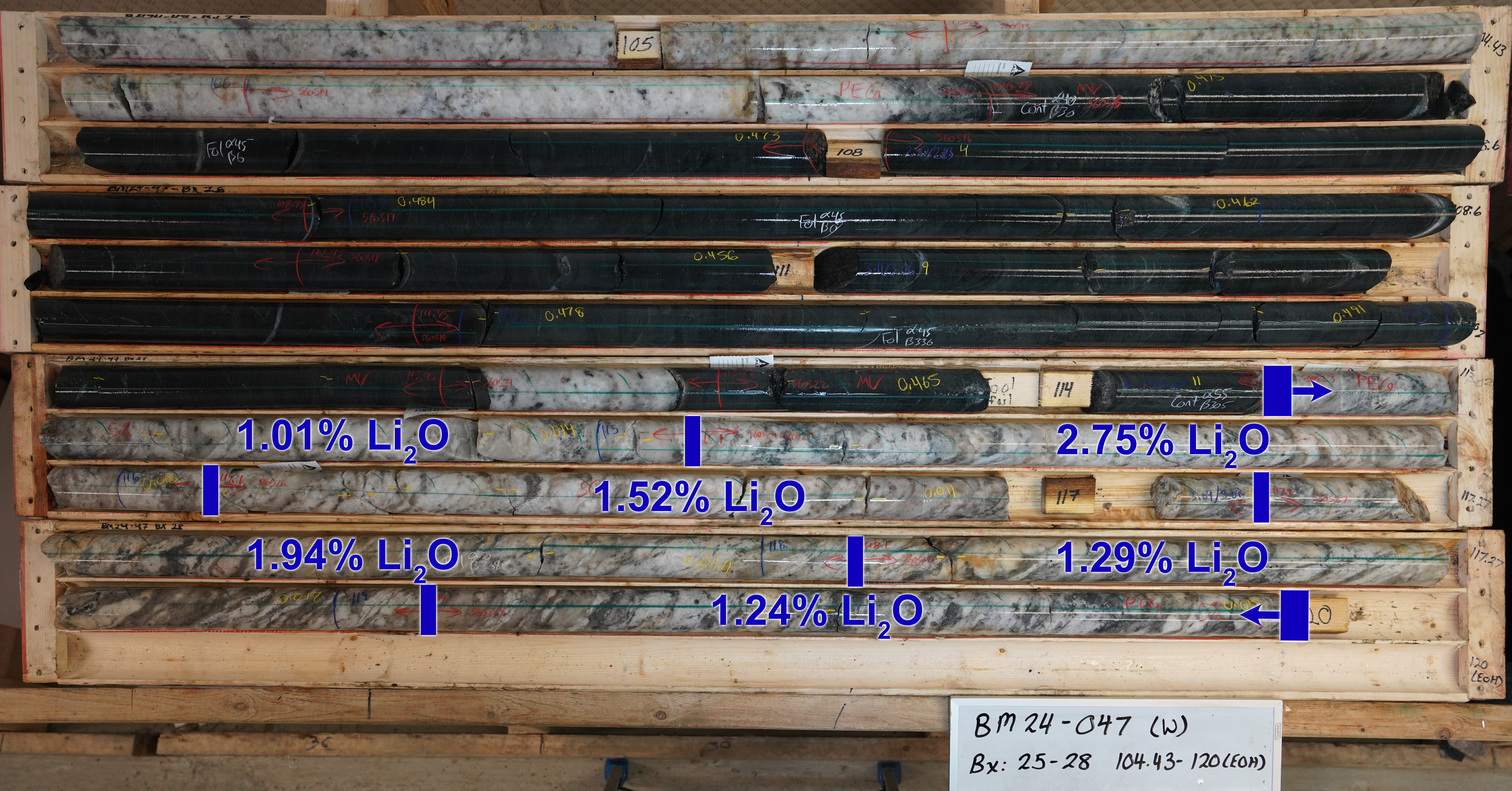 - 2.75% Li2O over 1.0 meters within a 5.83-meter interval of 1.64% Li2O (BM24-047) intersected approximately 70 m east of the main 6059/Sprinkler zone.