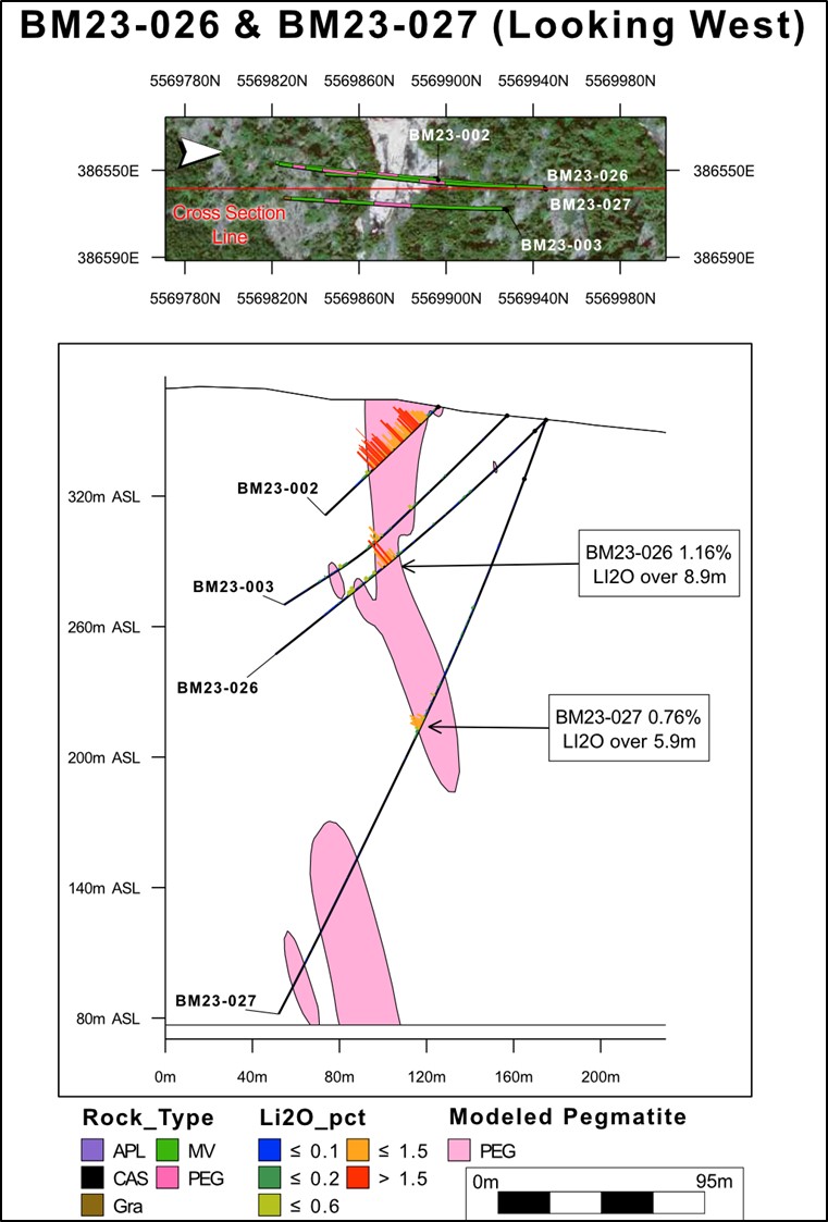 Holes BM23-023 to BM23-027 described in this news release targeting the Big Mack pegmatite were drilled broadly perpendicular and inclined to the pegmatite orientations so that the true thickness of reported intercepts is estimated to range somewhere between 50-80% of the drilled widths. Holes BM23-028 to BM23-031 were exploration holes targeting magnetic anomalies identified from the UAV-borne magnetics survey completed in 2023 by EarthEx Geophysical Solutions Inc. A collar header table is provided below. Visual core logging indicates that the predominant host mineral for the Big Mack pegmatites is petalite.