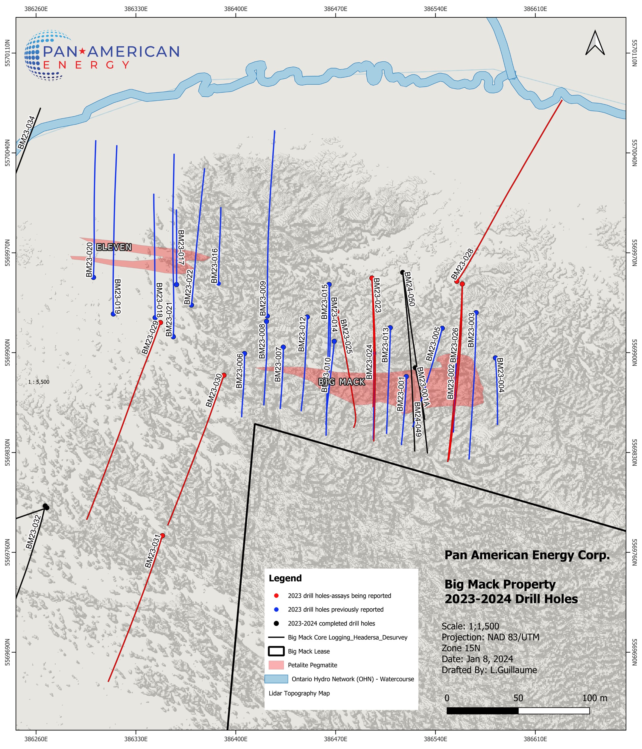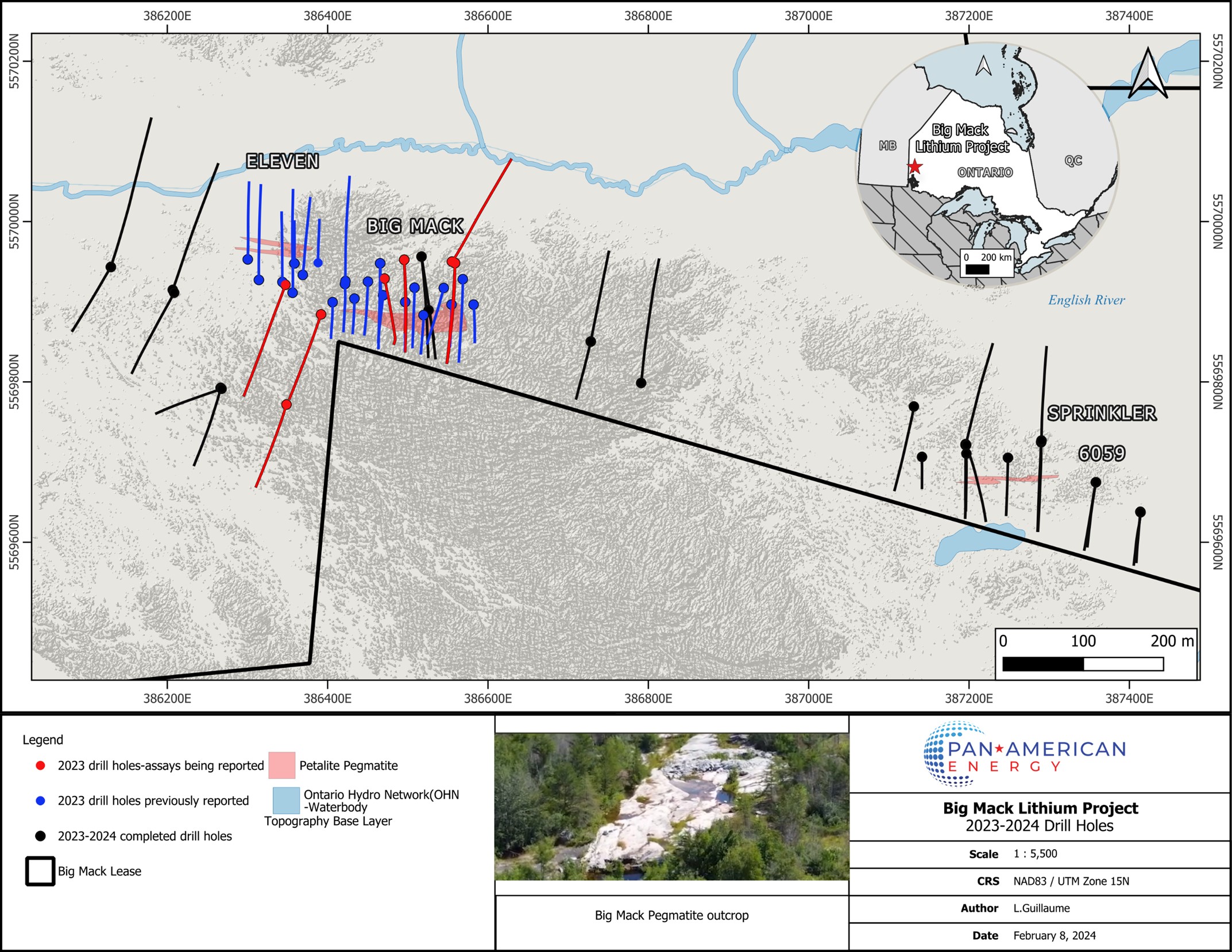 CALGARY, Alberta, Feb. 12, 2024 (GLOBE NEWSWIRE) — Pan American Energy Corp. (CSE: PNRG | OTC: PAANF | FRA: SS60) (“Pan American” or the “Company“) is pleased to announce additional assay results on nine holes from the ongoing 2023/2024 diamond drill program on the Big Mack Lithium Project (“Property”), located approximately 80 kilometers north of the town of Kenora, ON. The drilling campaign is being carried out by Full Force Diamond Drilling Ltd. (“Full Force”) under the geological guidance of Axiom Exploration Group Ltd. (“Axiom”).