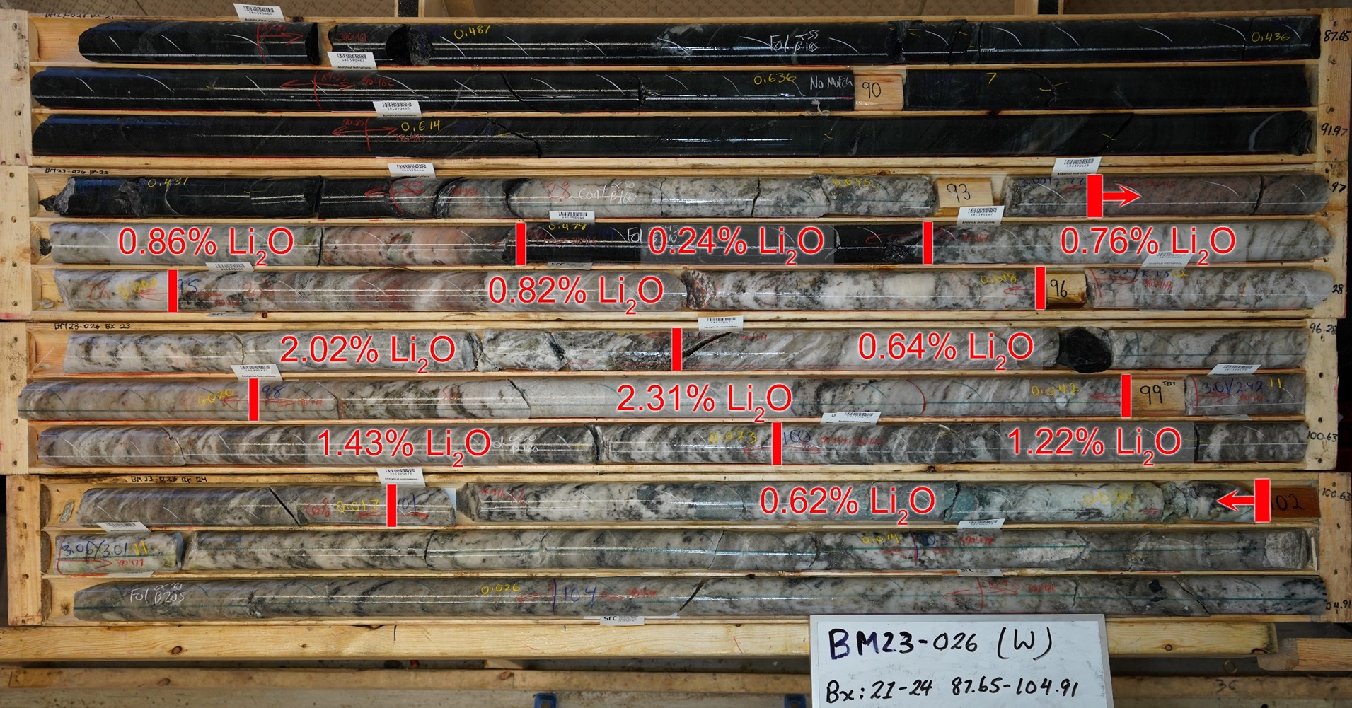 Figure 2: Core photo of hole BM23-026 (87.65 to 104.91m) highlighting Li2O% values in high grade intercepts from 93.10 m to 102.0 m (Red).